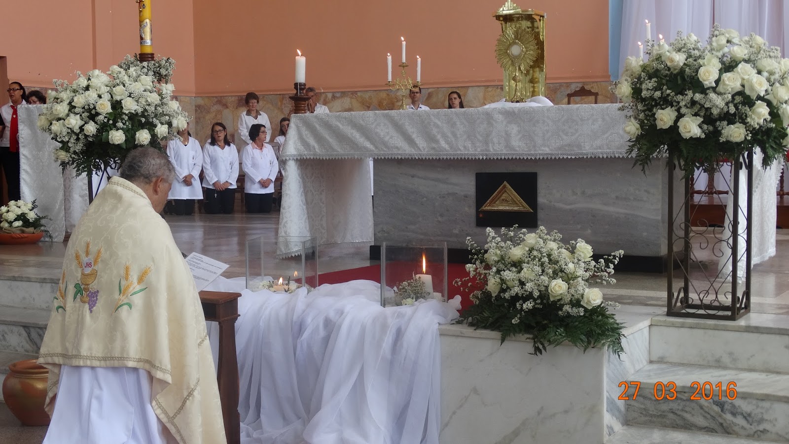 Na manhã deste domingo, 27 de março, celebramos na Matriz de São Sebastião, o domingo da Páscoa, presidida por cônego Tarcísio que em sua homilia nos deixou a seguinte mensagem sobre o significado da Páscoa para o cristão: " A alegria depois de uma caminhada de quarenta dias, do convite da igreja em fazermos uma penitência, assim como Jesus que passou quarenta dias e quarenta noites no deserto, onde tivemos a oportunidade de fazer memória à Paixão de Cristo. Desde a quinta-feira, no Tríduo Pascal, ao celebrarmos a última ceia de Cristo, passando pela via sacra e refletindo sobre a sua morte e hoje, ao olharmos para a cruz vazia e a coroa de fogo, abençoada na Vigília Pascal, simbolizando o Cristo ressuscitado no meio de nós, assim como o povo de Deus na Antiga Aliança, ao ser liberto da escravidão do Egito, conduzidos para atravessar o mar vermelho. Jesus é o novo Moisés, o novo libertador, não aquele que nos tira da escravidão do Egito, mas é o Cristo que faz conosco a nova e eterna aliança entre os libertos da escravidão, Ele nos resgata a uma vida em comunhão com Ele, está vivo e reino no meio de nós. Assim, devemos celebrar este dia como um projeto de vida, resgatar e nos salvar deste mundo. Este Deus quer fazer o caminho da solidariedade. Apesar dos pesares da nossa sociedade caminhar na contramão do projeto de Cristo, nos arrastando para a destruição das famílias, do aborto, dos vícios e da permanência do pecado, devemos lutar contra estas tentações, satanás continua nos chamando e levando para estes caminhos, e ele quer especialmente àqueles que rezam e estão na presença de Cristo, por isso, devemos continuar rezando para que não sejamos seduzidos pelo inimigo, ele quer o nosso coração, a nossa vida e busca quem está na caminhada cristã.