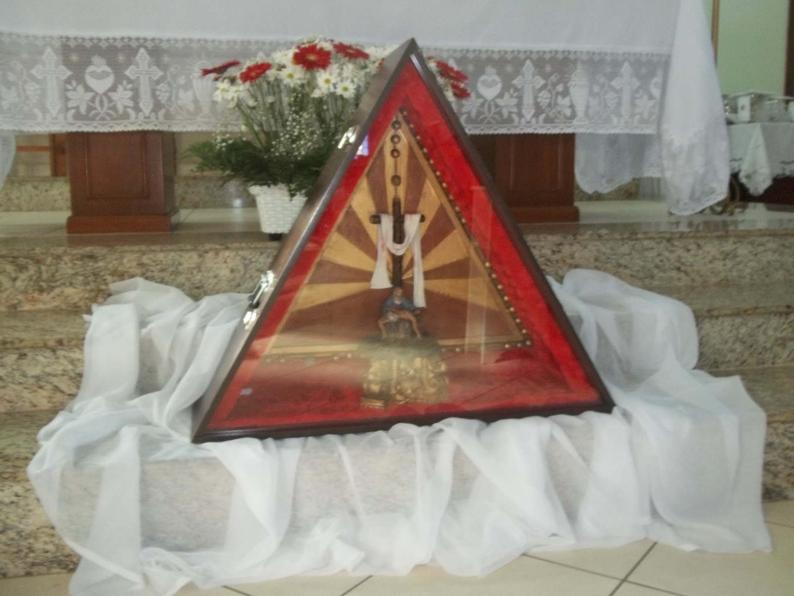Na procissão de entrada, o ícone de Nossa Senhora passou por um corredor formado pelo grupo do terço dos homens. O celebrante iniciou a reflexão dizendo à comunidade que devemos ser família de fé, e sugeriu que abríssemos o coração para este acolhimento da pessoa de Maria, hoje intitulada Senhora da Piedade.É uma graça para toda a comunidade. Ela recebeu este título por estar aos pés da cruz, foi lá que Maria expressou a sua maternidade. Ali foi realizado o verdadeiro ofertório. Devemos contemplá-la, porque ela foi agraciada, a escolhida.
